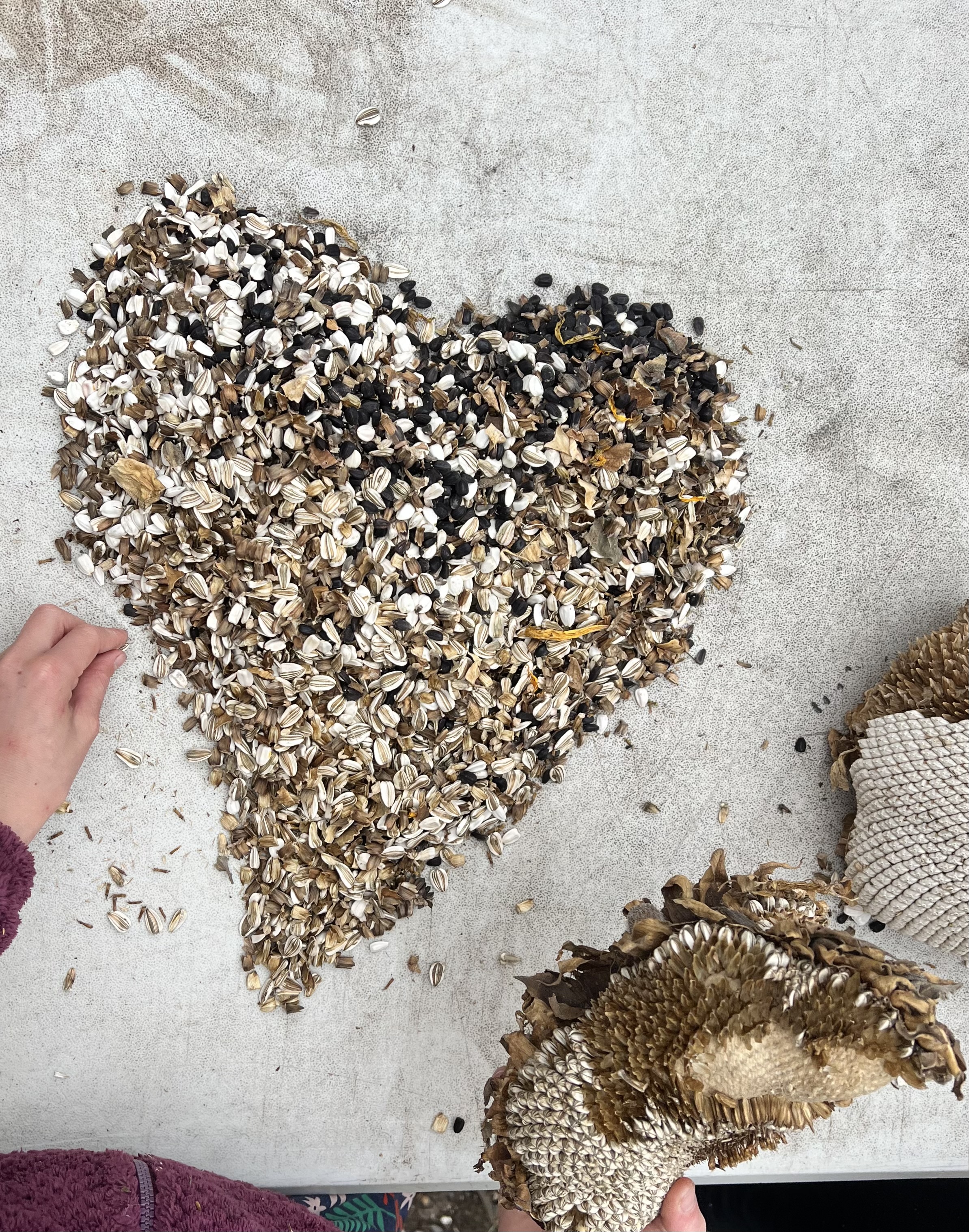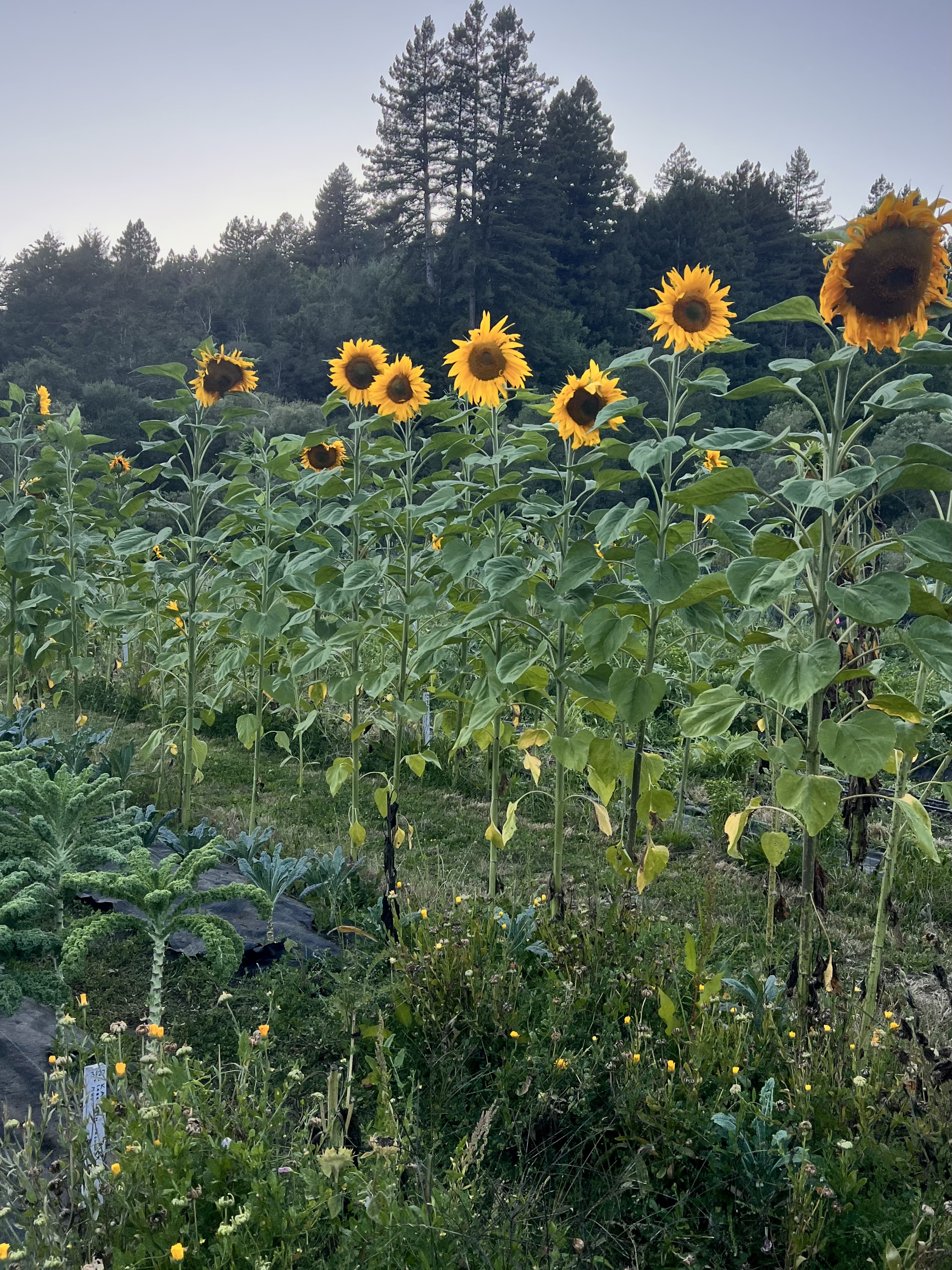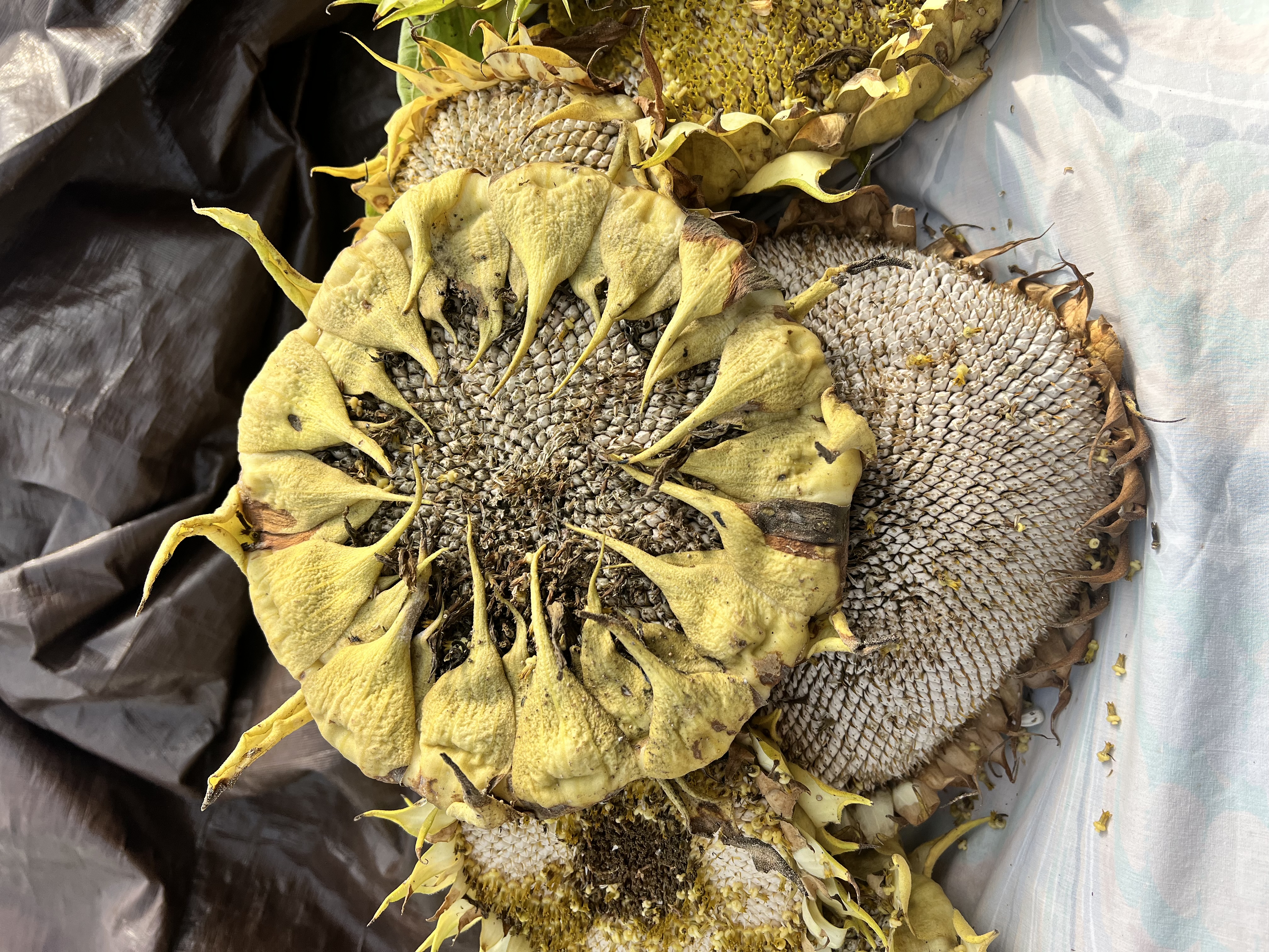 Rewind to springtime; I had proposed that we have a field row dedicated to mammoth sunflowers. I had remembered when I had worked at Tucson Village Farm and the kindergarteners and I planted a hedgerow of mammoth sunflowers to divide the street from the demonstration farm. This inspired the reality of our beloved Sunflower Boulevard, which the school children and I planted lovingly in March. It was such a beautiful process to grow with these towering pillars of photosynthesis. We aspired to be like them, beginning our mornings as a Crew by turning our faces towards the Sun, soaking in the warmth and transforming it into strength filled golden radiance. By the time school groups returned for their Fall semester, the sunflowers heads began to hang their heads heavy with healthy seeds, their greens revolutionized to light yellow and their petal halos decomposed on the rich soil below. Songbirds perched on the edges of their crowns and peered into their faces, nibbling black and white striped packets of potential life. Ants marched up the towering trunks in pairs, busy farming tiny green aphids in the nape of the sunflowers. We human farmers admired the diligent little Formicidae, their organization to cultivate their bug food in the cosmopolitan environment of the colossal skyscrapers motivating. After the leaves had dried and heads victoriously decapitated, the giant saucers were put to dry and deseed. Children paraded down the boulevard and each chose a head and learned how to save the seeds. Like nature's fidget toy, they found themselves consumed with the activity. Nibbling on a few seeds, pocketing a handful for their own planting, and saving the rest for our farm animals and next year's planting, this satisfying cycle was closing to an end. We weeded and added compost to the soil where the stalks stood sturdy in the shoulders of the boulevards and transplanted snap peas for the winter months. Training these delicate vines to the woody stakes, we hoped for the best.