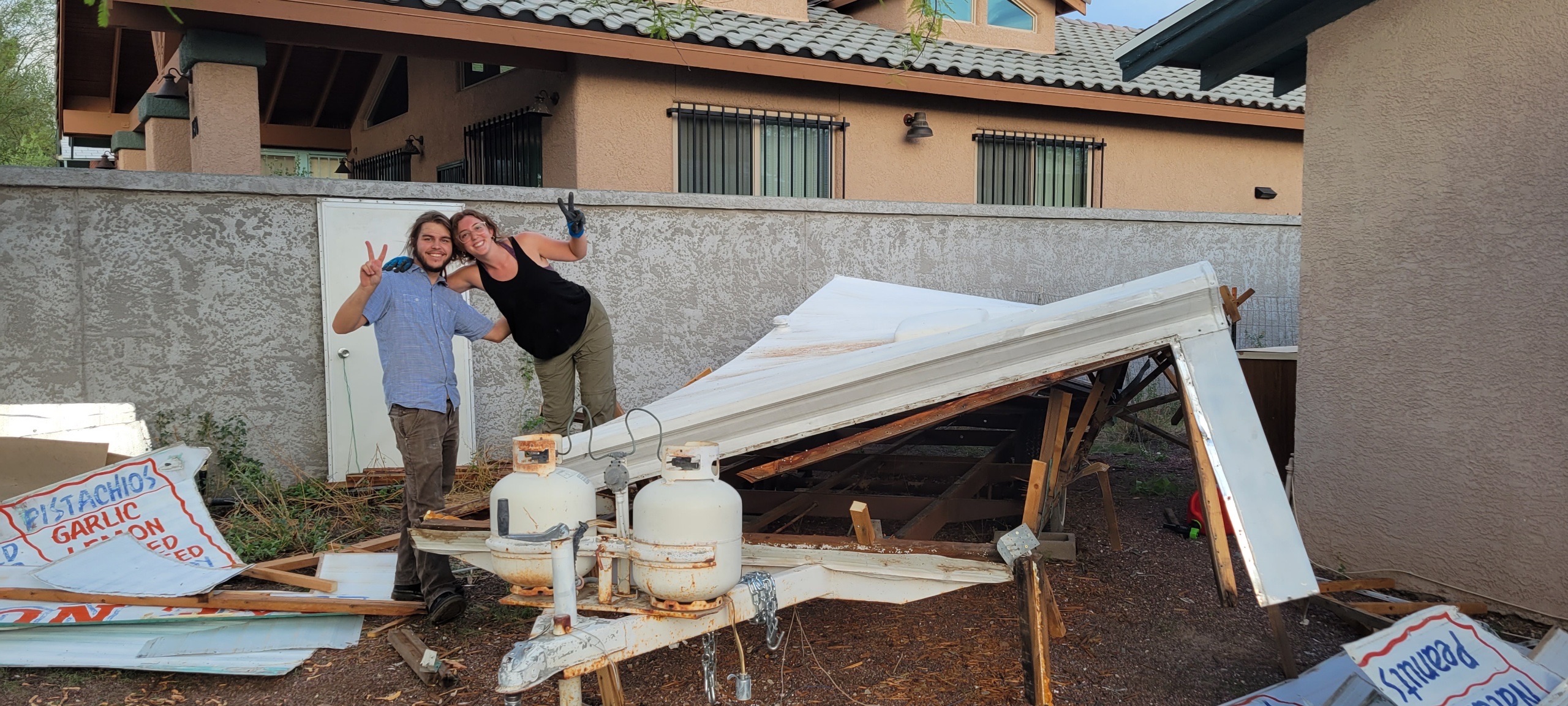 After the business with the citation, we were highly motivated to finish the demo. The demolition process ended with one climactic push - we had worked a full day with our dear friend to remove the windows, metal vents, weaken the wall structure and exterior, and finally we were ready to do the big demo… I stood inside and kicked the front wall, and the whole front part slowly leaned forward, the roof dipping down, supported by Isaac and Brandon from the exterior side. That marked the fall of the old relic, and revealed the foundation of our “new” home.