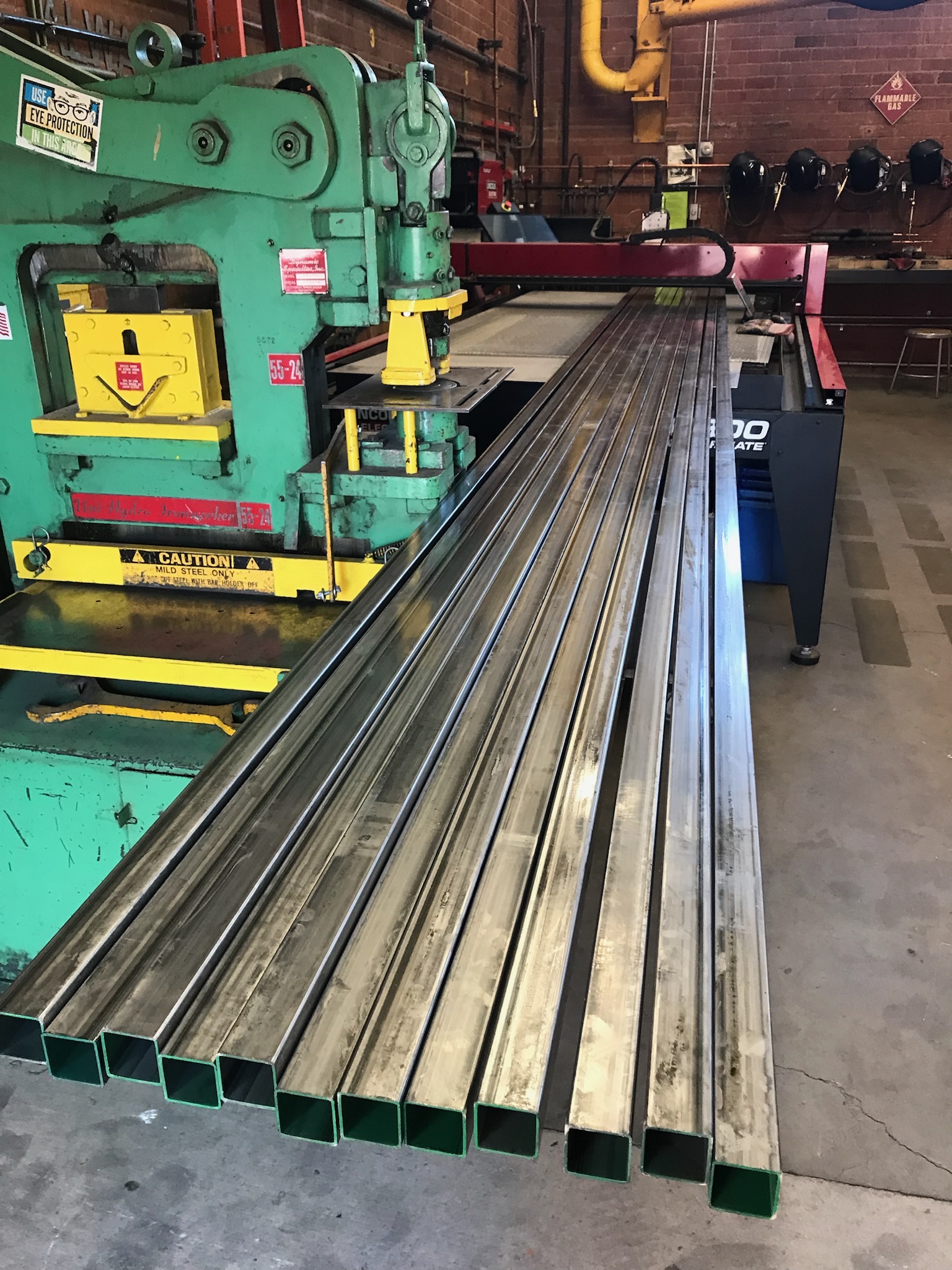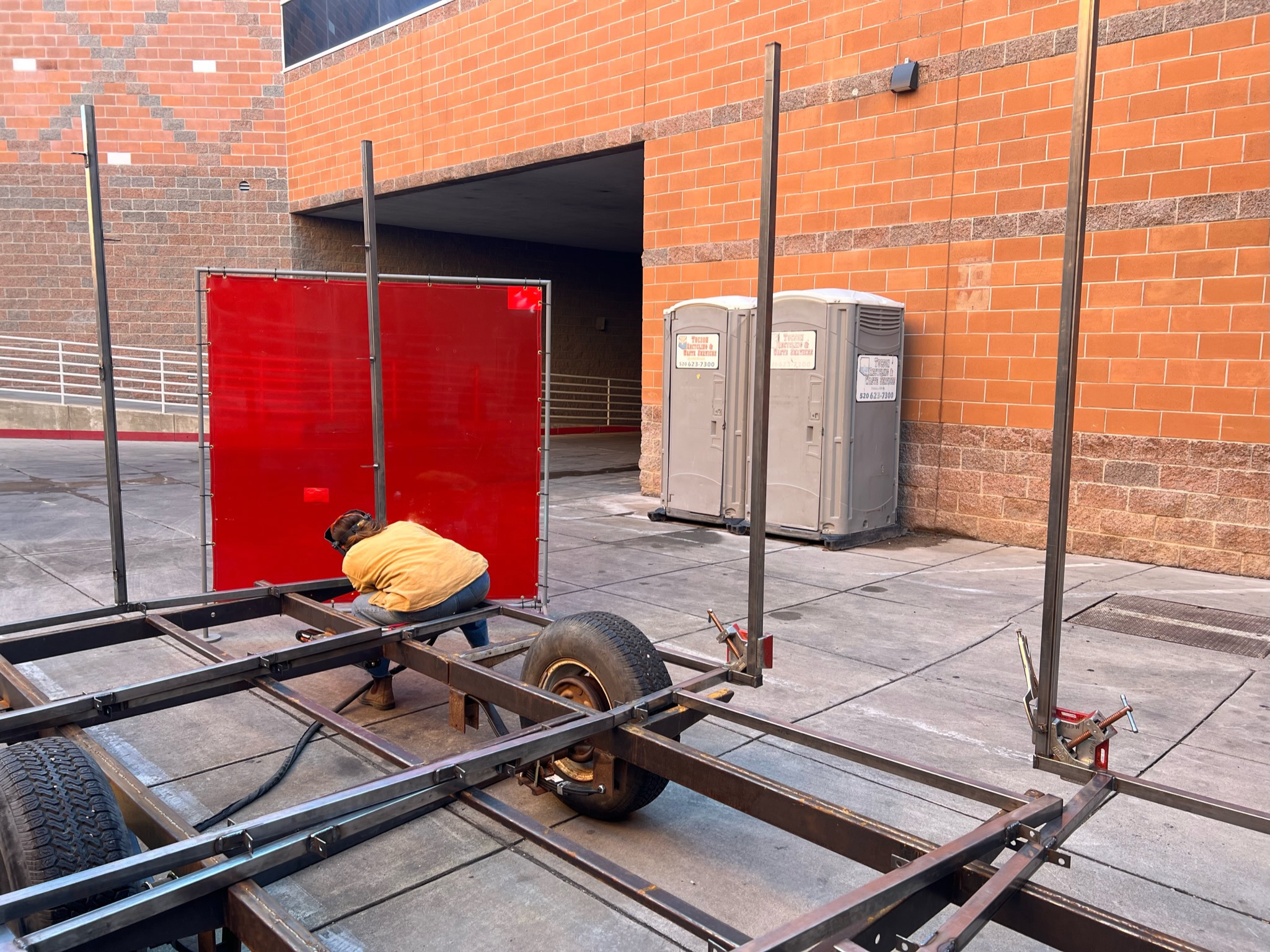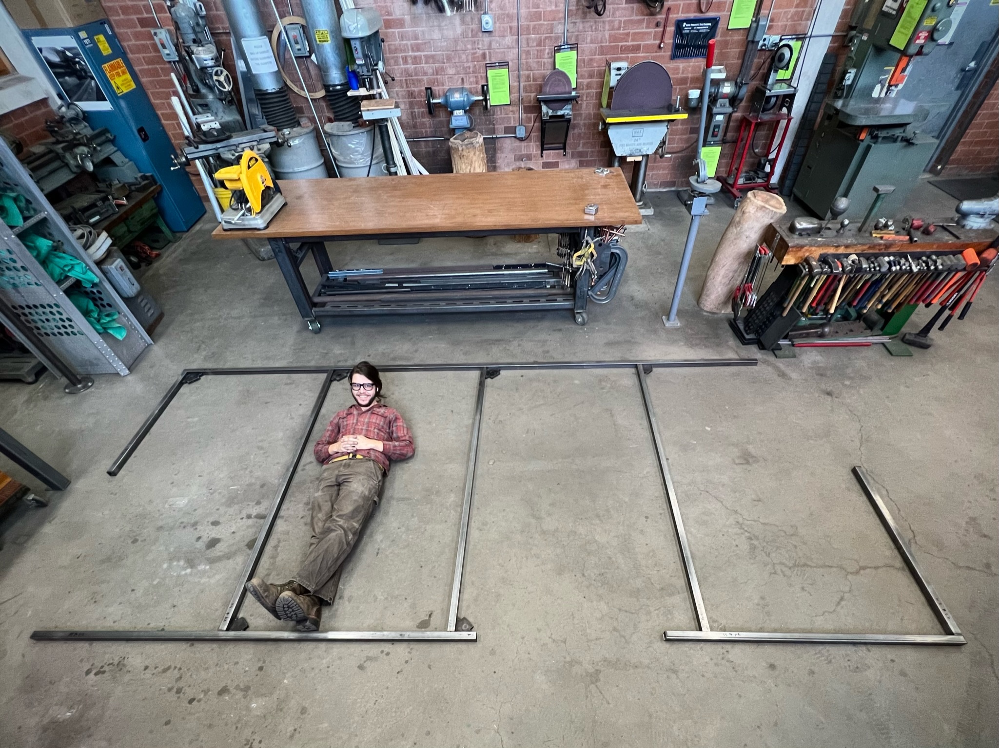 On October 19, 2022, I waited at the UA Art College Loading bay for my highly anticipated shipment. A shipment of steel. A BIG shipment of 12 square steel tubes, 24’ long. A shipment that was delivered in a literal semi truck. The delivery man was surprised to see that I was the person the order was for, and even more surprised that I was the only one there to unload my order. He said he was contractually not allowed to help unload, so he watched me as I balanced and carried each of these tubes 4 times my own height into a pile next to the loading bay of the art college. I got them into the shop, and felt equally strong as I did independent and exhausted. A 5’4 22 year old purchasing hundreds of dollars of steel tubing?? Life is crazy. From there, I religiously followed Isaac’s designs to cut, sand, clean, and label the steel so construction would be streamlined. I began to weld together the tubes for the walls, then completed side projects like making the 118 steel tabs from raw steel for the wall support structure.