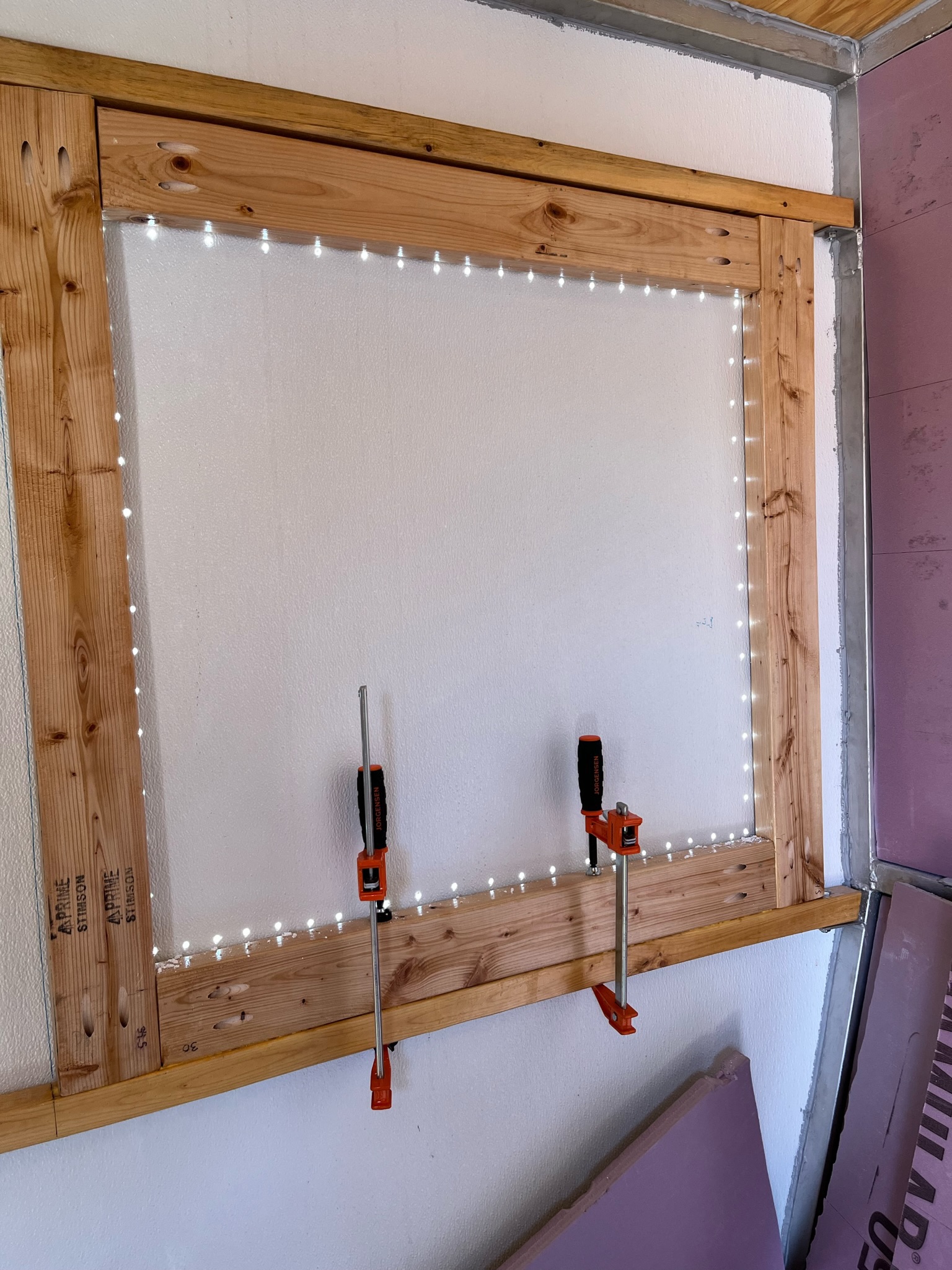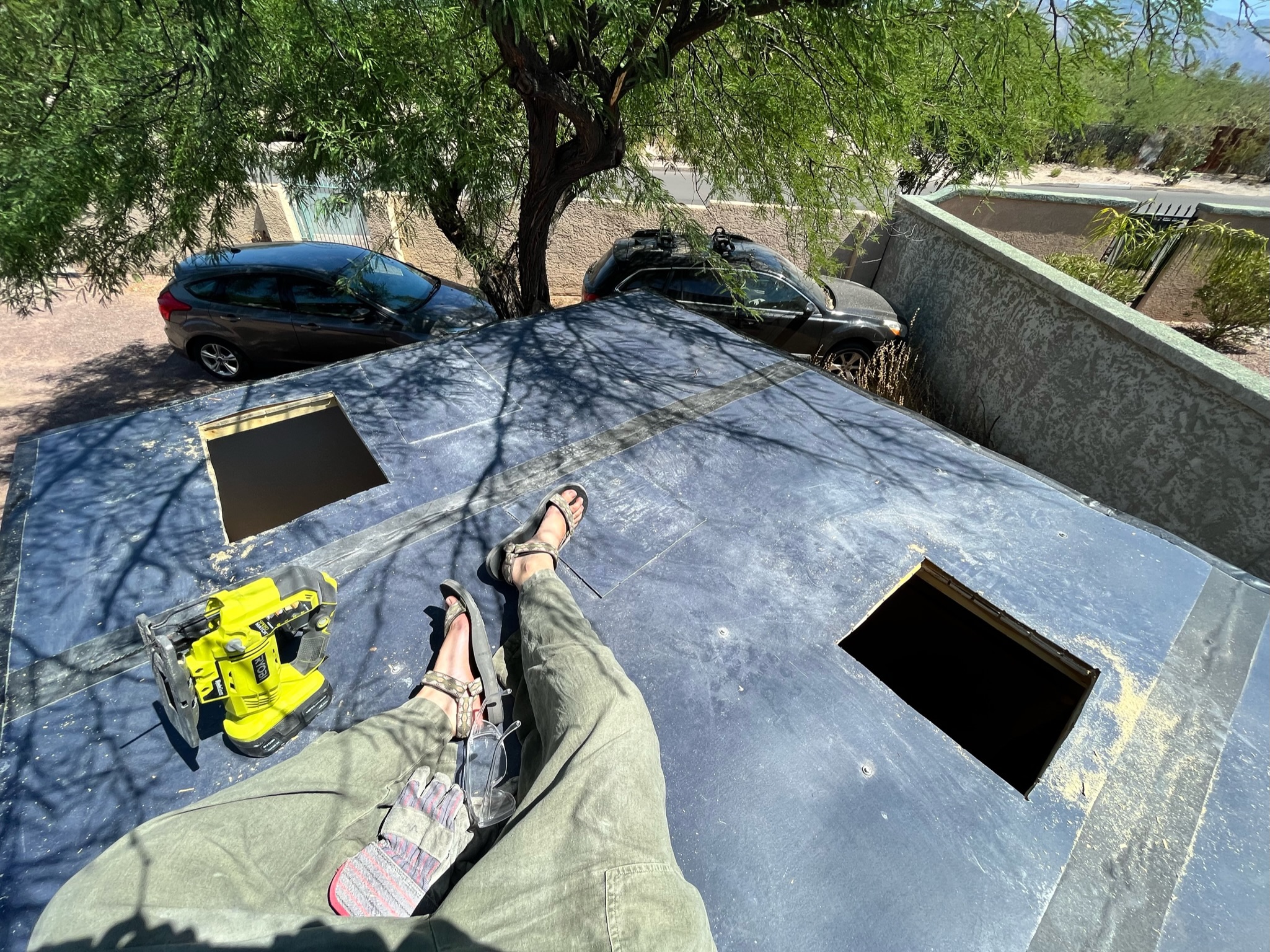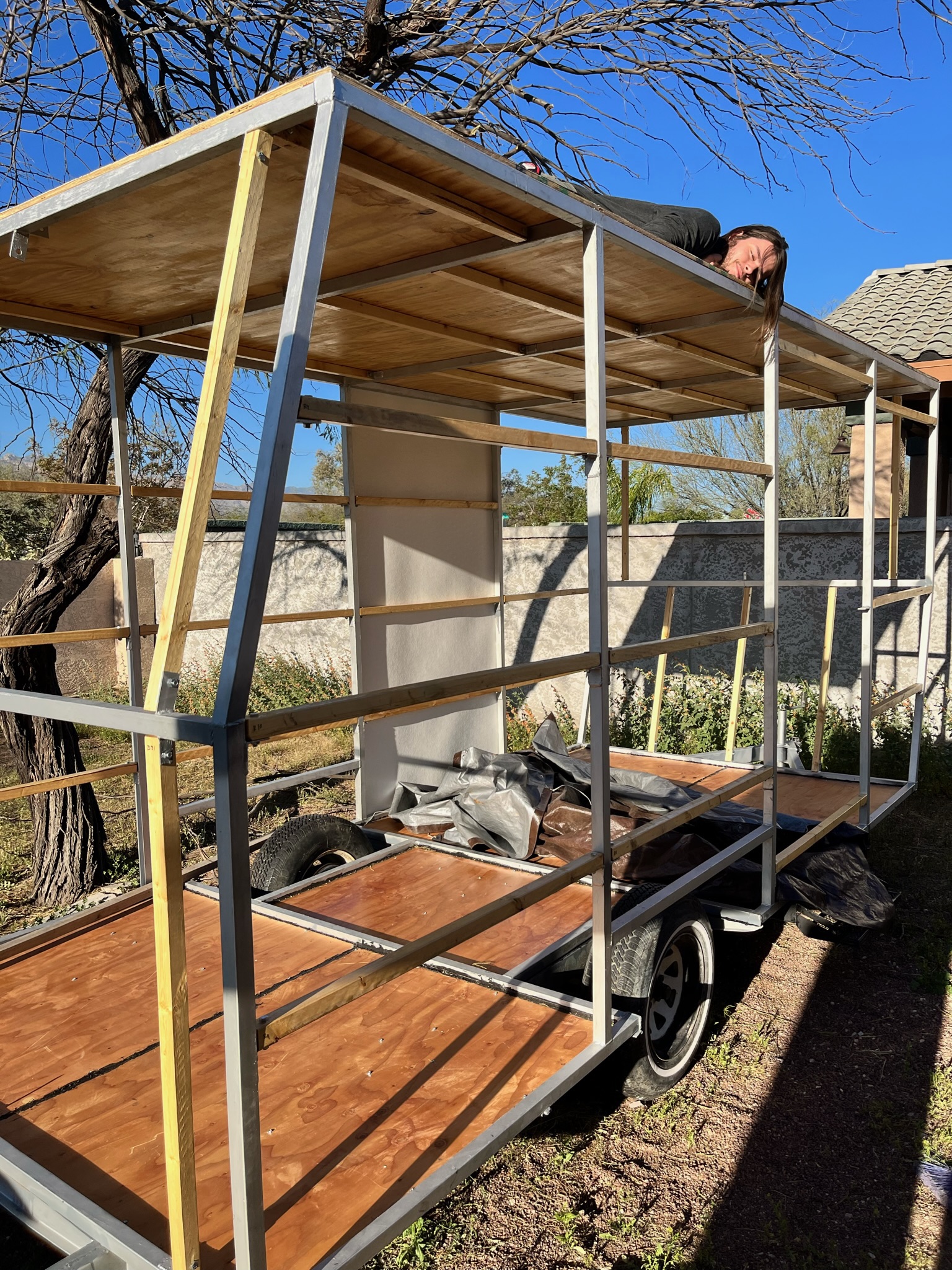In general, every piece of construction wood had to be measured, cut, sanded, and sealed for weatherproofing of some sort. Our Ryobi tool collection had exponentially exanded, as have our graveyard of Ryobi-exclusive battery packs. Isaac and I spent a long night cutting and laying the tongue and groove flooring we salvaged from Isaac’s generous aunt and uncle. We spent a small fortune on sealant and calk this far, and filled in some gaps in the flooring with it. I built the window frames and became an expert in pocket-screwing (Kreg rules supreme). Then I embarked on the nonintuitive task of cutting holes in the walls to reveal the door, 4 windows, skylight, back garage door, and wheel wells on either side. I cleaned the old crud and installed our 2 side widows we salveged from a second-hand material yard in Tucson, and a new skylight from Amazon for a good price. Isaac built a beautiful doorframe and cedar fencepost front door, and I delicately calked around all the openings after the frames were installed. I bought 2 large opening windows on struts built for food trucks from Amazon for the front and back of the tiny home. These giant windows were about $500 each, and delayed a week and a half, which really set back our deadline. When they finally arrived, they sent us a model that has a solid material instead of clear plexiglass. Not wanting to compromise on a solid window and not having time to return the windows to the vendor, I spent a day cutting out the interior material, cutting plexiglass to fit in the frame, and setting it with caulk. We definately do not recommend this, and have regretted this decision since, as we know our time is limited with their durability. We also placed heavy roofing tape on the seams of the FRP, which is not my favorite to look at but is imparative for the trailer’s functionality to keep out water, protect the edges of the panels, and allow the materials to torque with the shifting movement of the trailer. With the windows, skylight, vent fan, and door installed and as water tight as possible, Isaac worked on the exterior light installation on the trailer. He wired everything together and we installed the retro style lights from Amazon on the exterior. I spent a few excrutiating days measuring, cutting, and painting the interior wall panels made of luan, and miraculously erected the inside. Isaac installed the roof brackets and 3 salvaged solar panels for our power set up. Our power system was developing, but we still needed to actually build the living components of the interior.