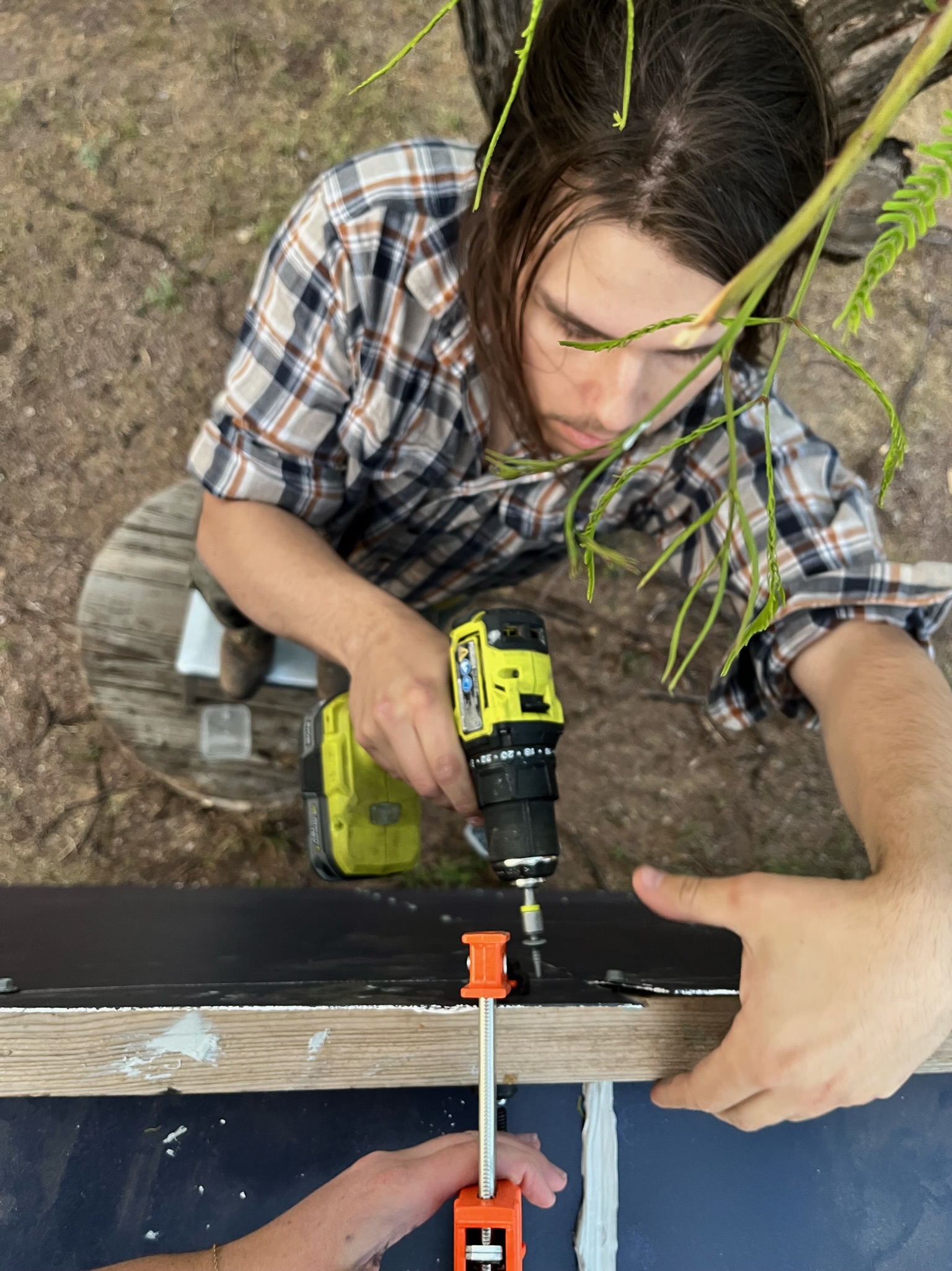 December 5, 2022: the trailer returned to our house, but this time it had steel framed walls! We painted the raw steel with a silver steel paint meant for auto frames, and began cutting, sealing, and installing the ceiling and floor plywood. Next was the 2x2 wood spacers on the interor walls for the FRP to screw into. We decided on FRP (fiber reinforced plastic panels) for the exterior of the walls because it is relatively light, UV protected and scratch resistent, paintable, and thin. In our front yard, we cut each piece to size and sanded one side so we could paint it the deep navy color I had been imagining for months. Wearing full protective gear so the plastic dust didn’t get in our lungs or irritate our skin, we repeated the process for the 12 wall panels and 4 roof panels. Some of the mini projects I had worked on during my Independent Study time with the college shop were put to use right away, while others had to wait their turn.