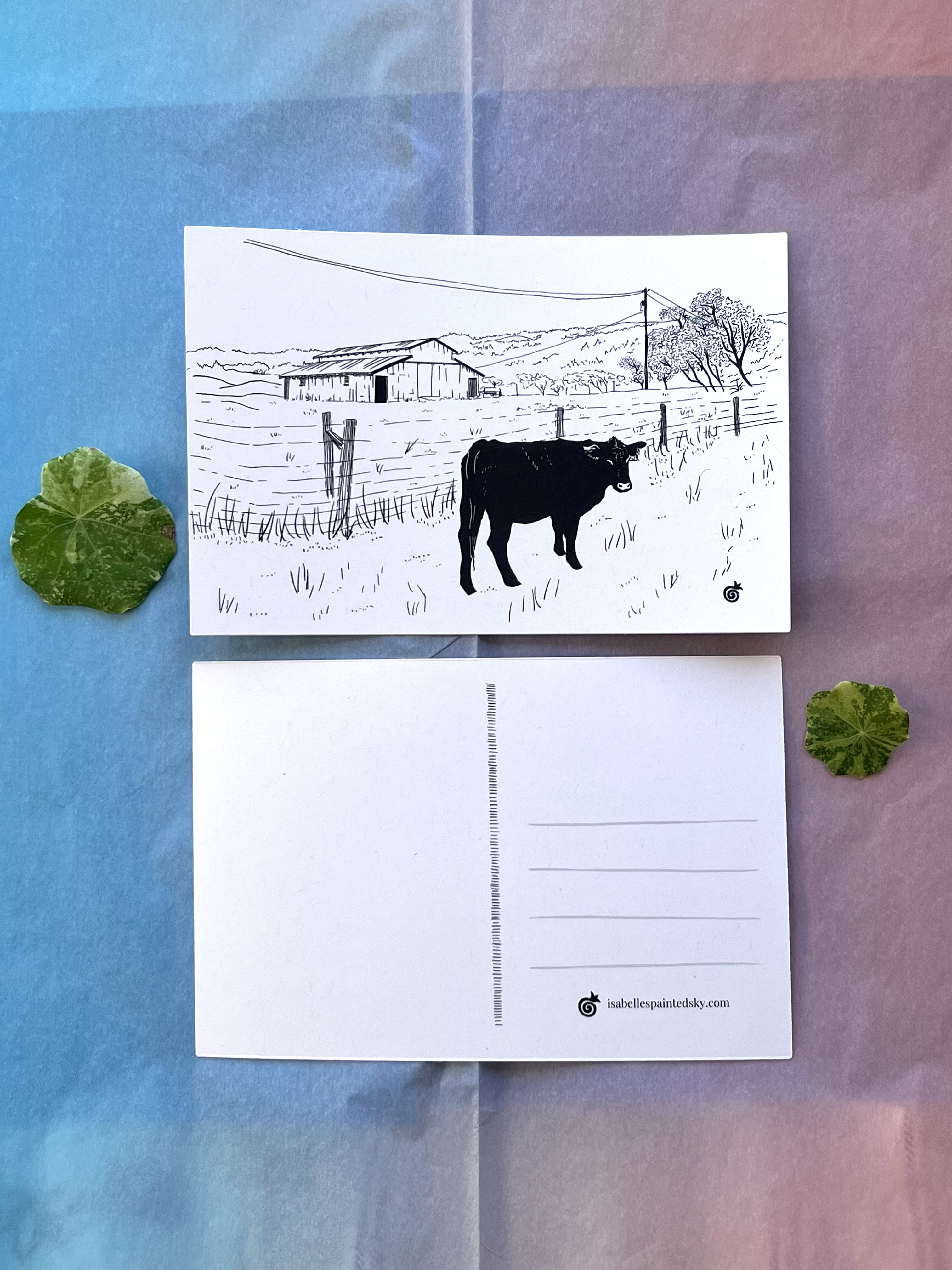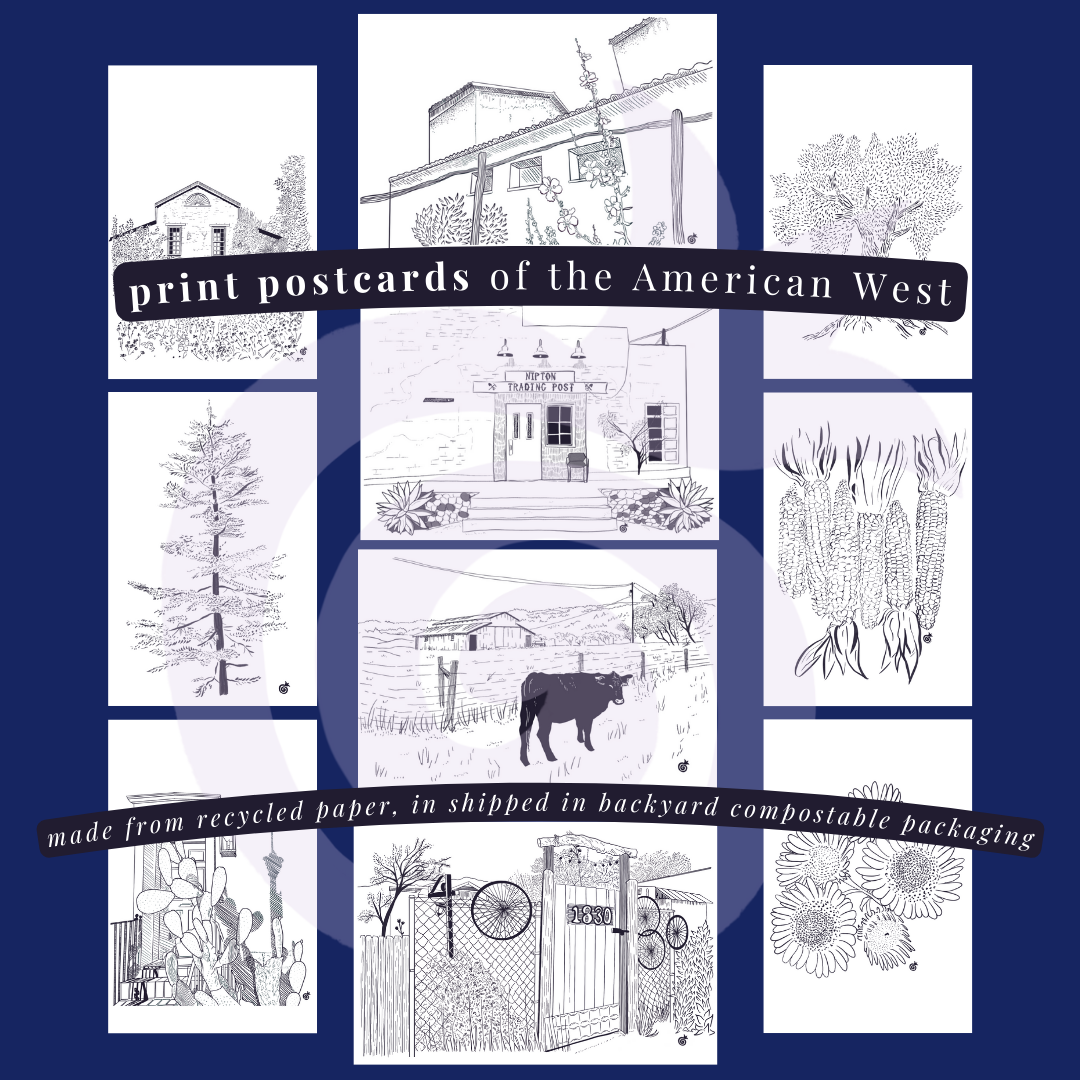 Print postcards include scenes from our travels, including places in Arizona (Tucson, Flagstaff, Sedona and Superior), California (Nipton, Eureka) and Utah (Salt Lake City). These scenes are drawn in my minimal, whimsical, and realistic art style. You can customize your order to adjust the amount of total postcards you desire, as well as the illustration scenes I pack for you (if you want 10 postcards all of the grazing cow in Eureka, I won't judge you!).
