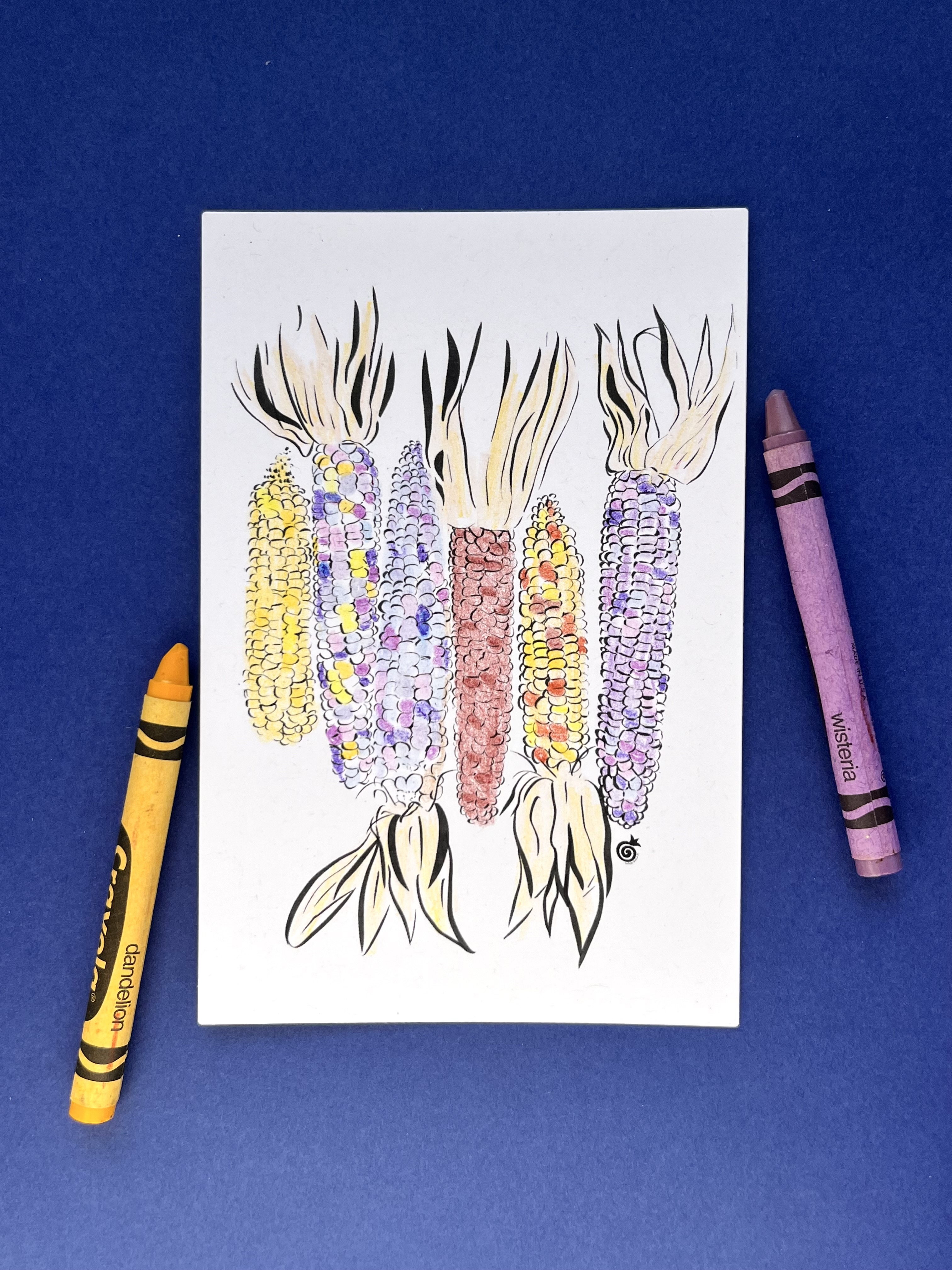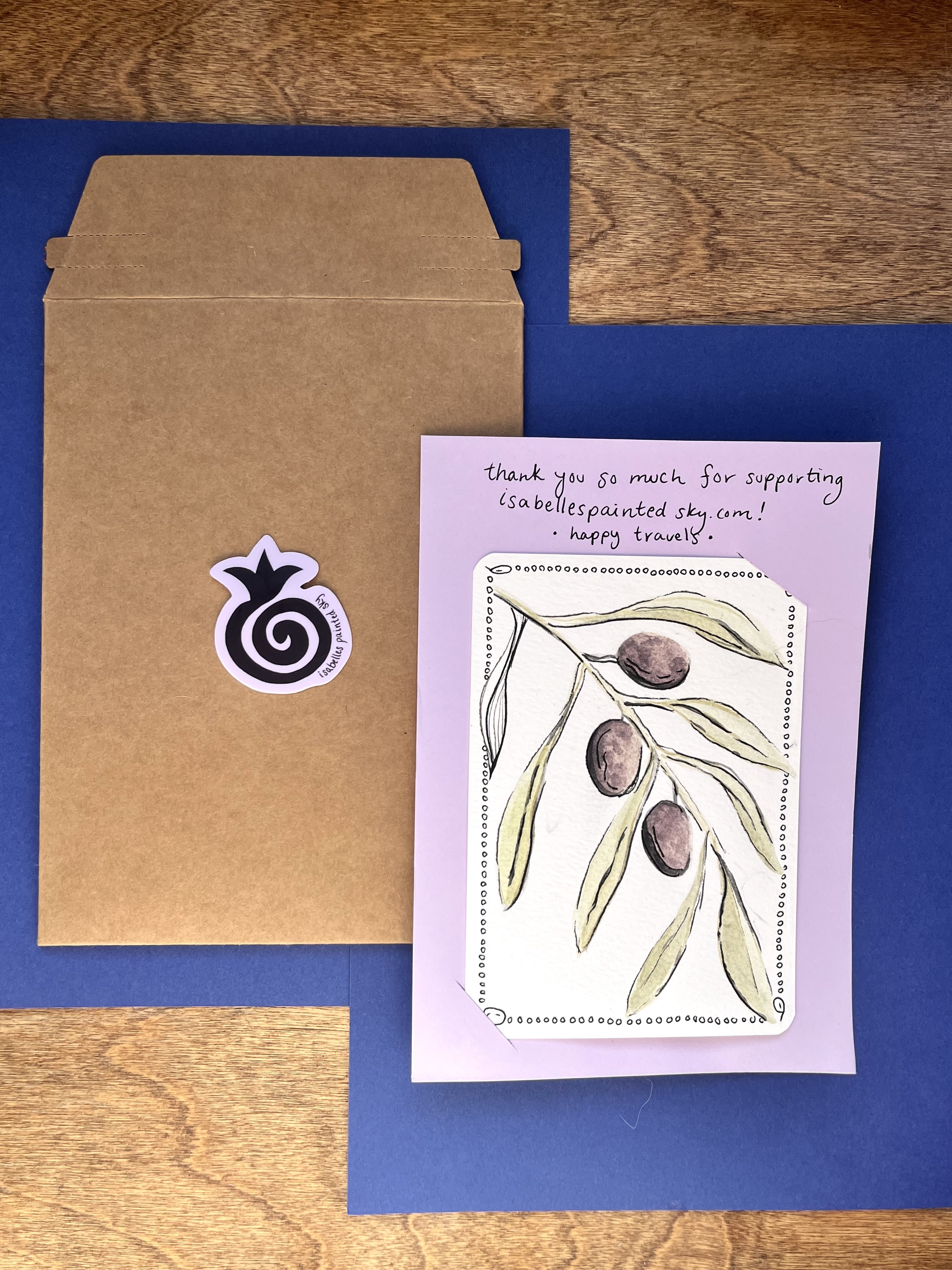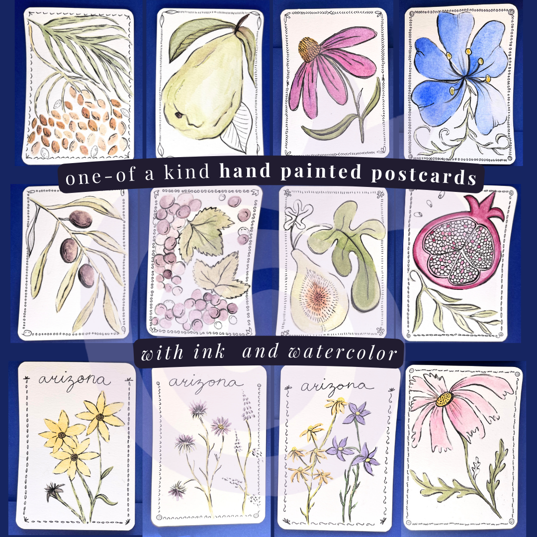 Hand painted post cards are all one-of-a-kind, so there really is just one of each illustration (no artificial scarcity here...). These designs feature some of the Seven Species of Israel, wildflowers, and a few fruits in my more illustrative and crafty art style.